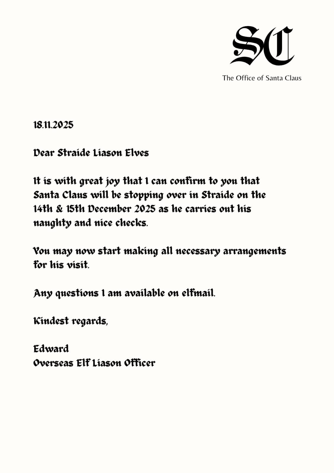 We’re delighted to announce that Santa has been in touch and has confirmed that he’ll be stopping over in Straide again this year. He’ll be here from Sunday 14th - Monday 15th December. You can book your slot by clicking the booking button below!